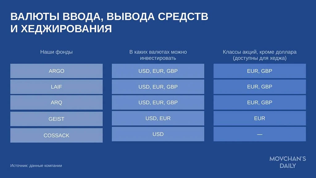 В нашей линейке фонды имеют по нескольку классов акций, номинированных в разных валютах: доллар (не требует хеджирования), евро (можно хеджировать) или фунт (можно хеджировать). То есть инвестор может вводить и выводить деньги в евро или фунтах с конвертацией в доллар или без.