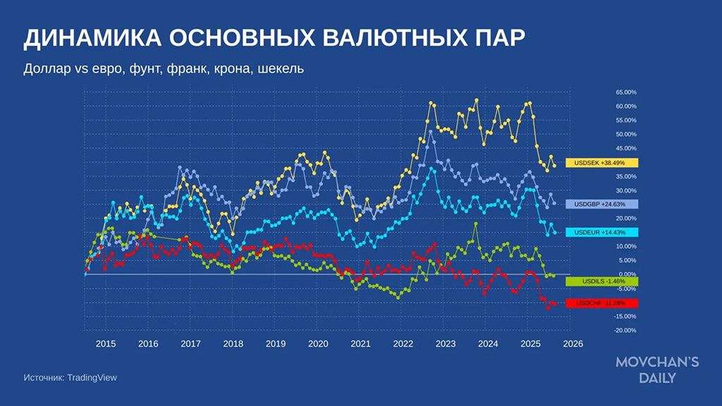 С начала 2025 года индекс доллара (DXY) потерял 10%. Это внесло переоценку в портфели инвесторов по всему миру: активы, торгумые в валюте США, подешевели в валютах, отличных от доллара (евро, фунт, франк и др.). И наоборот: не американские инструменты, торгуемые в местных денежных единицах, получили дополнительный прирост, если считать в долларах.
